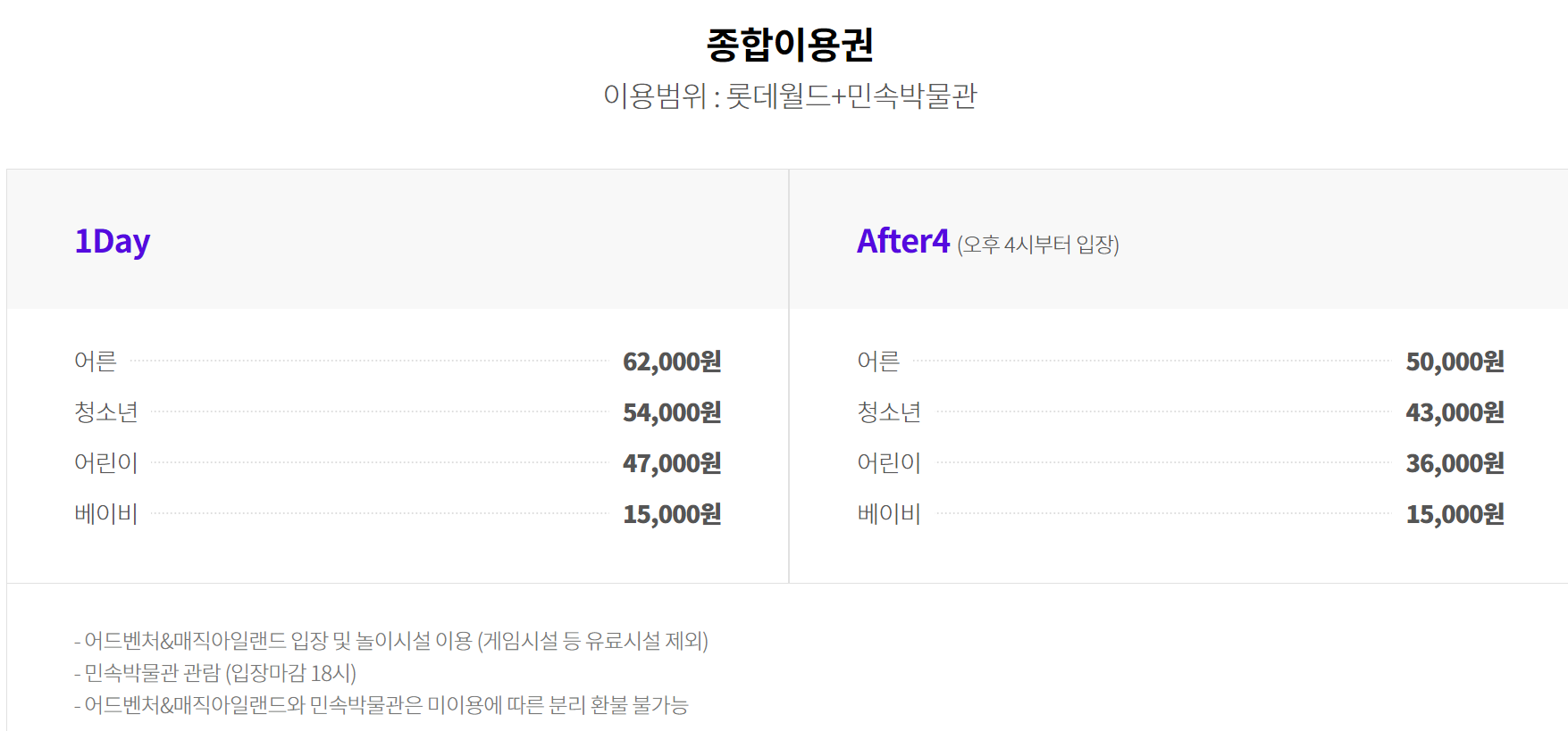 - 가격 종합이용권 62,000원 (할인혜택 홈페이지 참고)