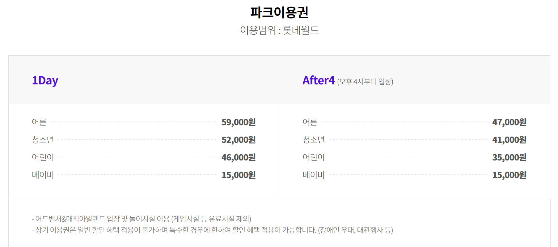 이 이용권은 롯데월드만 이용가능한 이용권이지만 카드 할인의 기준은 '파크이용권' 이 아닌 '종합이용권'이므로 위의 표를 더 유의깊게 보아야 할 것 같습니다.